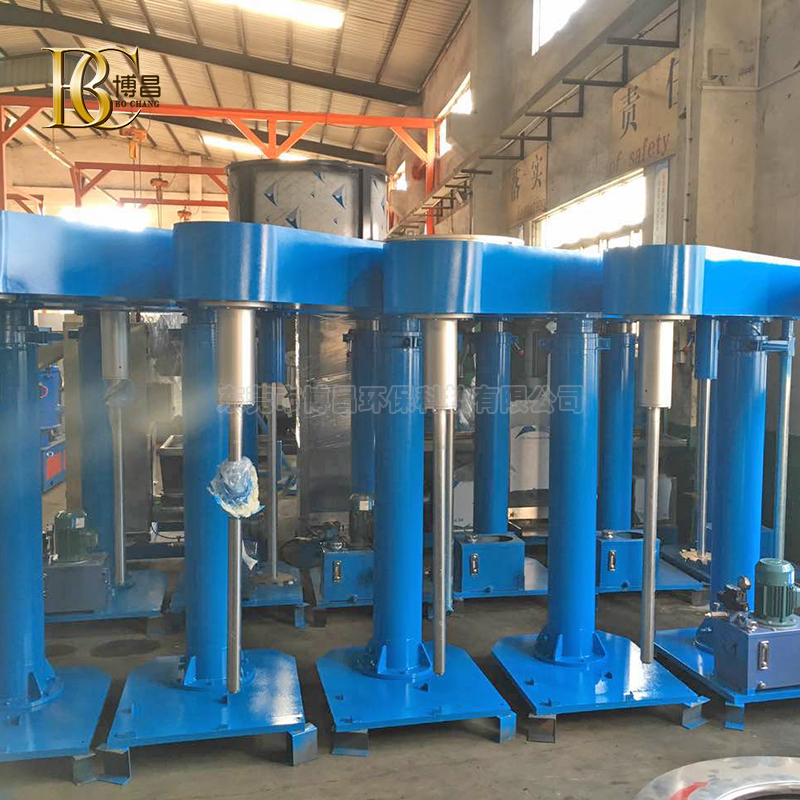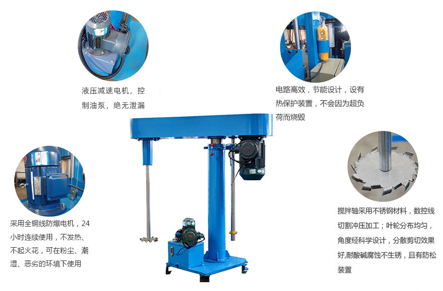 液壓高速分散機的鋸齒狀圓形分散盤在容器內高速旋轉完成固液分散、濕潤、解聚、穩定過程,使漿液呈滾動環狀流,產生強旋渦,漿液表面粒子呈螺旋狀下降到渦流底部;在分散盤邊緣2.5-5mm處形成湍流區,漿料及粒子受到強烈剪切及沖擊;區域外形成上下兩個束流,漿料得到充分循環及翻動;分散機的分散盤下方呈層流狀態,不同流速的漿料層互相擴散,起到分散作用。液壓高速分散機具有液壓升降、360度回轉、無級調速等多種功能。可同時配置2-4只容器,液壓升降行程1000㎜、360度回轉功能能更好的滿足一機多用,能夠在很短的時間內從一個缸變換到另一個缸進行作業,大大的提高了工作效率,同時也降低了人工勞動強度。