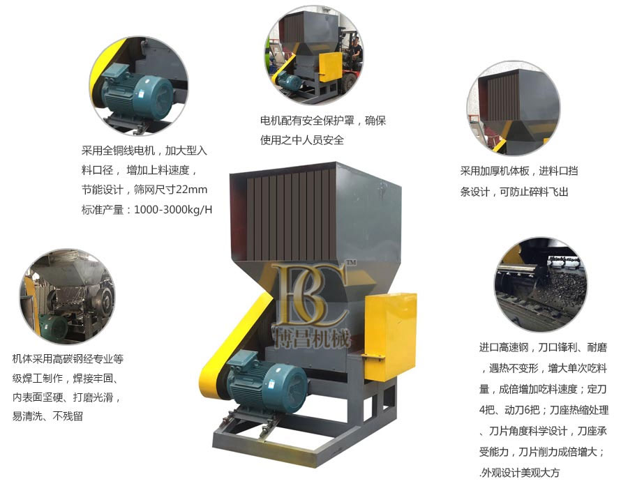 可用于箱類、薄管件、吹塑件、瓶、殼、板、罐、生活塑料用品等所有廢舊塑料的再次粉碎回收或作為注塑機的輔助機器對注塑機水口料或次品件進行重新粉碎利用。